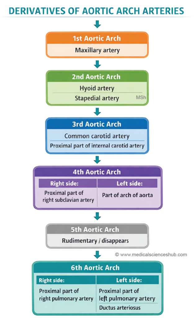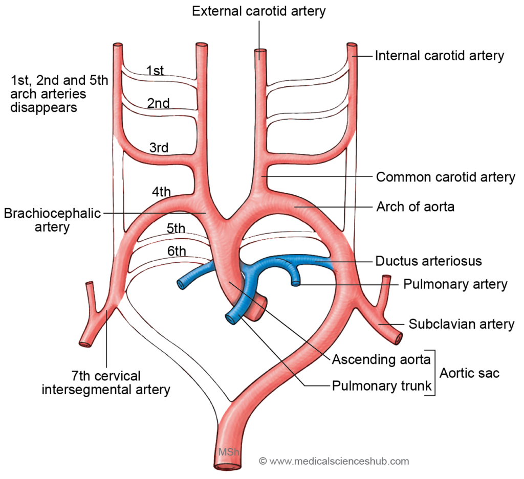 • Initially, six pairs of aortic arch arteries develop. However, the fifth pair usually regresses and is often absent in many embryos. Consequently, the arch arteries are conventionally numbered I, II, III, IV, and VI in a cranio-caudal sequence.
