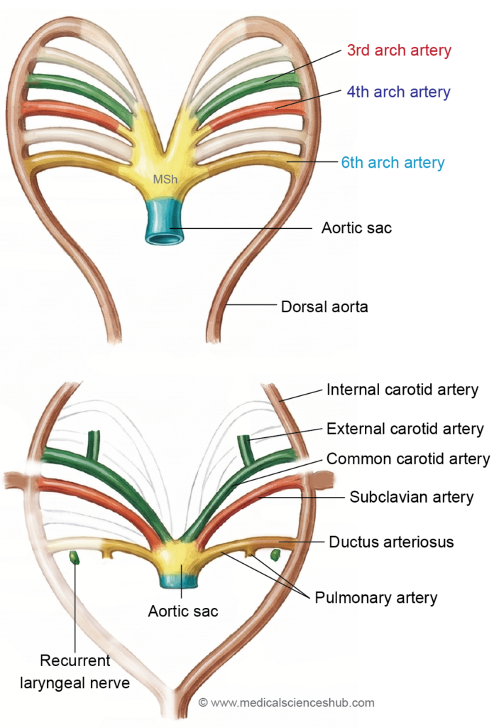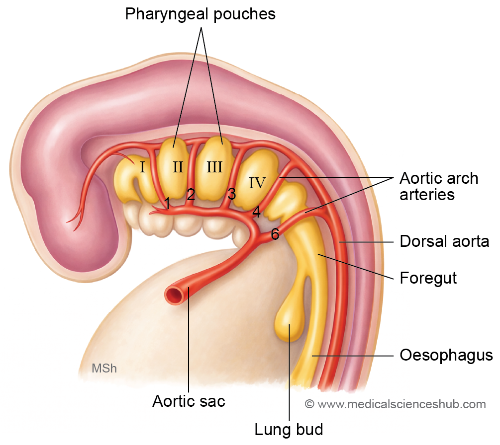 • Each pharyngeal arch receives an artery known as a pharyngeal arch artery. These vessels connect the aortic sac to the dorsal aorta and supply the developing arches. The pharyngeal arches and their arteries appear during the fourth and fifth weeks of development.