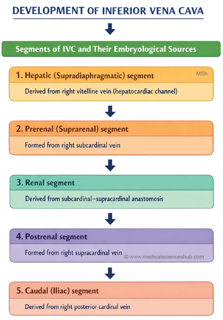 • Congenital anomalies of the inferior vena cava arise because its development involves multiple embryonic veins, including the posterior cardinal, subcardinal, and supracardinal veins. Abnormal persistence or regression of these channels can lead to several clinically significant variations.