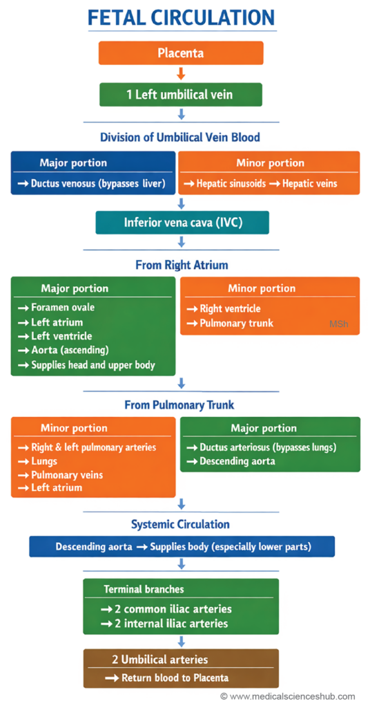 • Several specialized structures enable efficient circulation in the fetus and allow blood to bypass organs that are not yet fully functional, particularly the lungs and partially the liver.