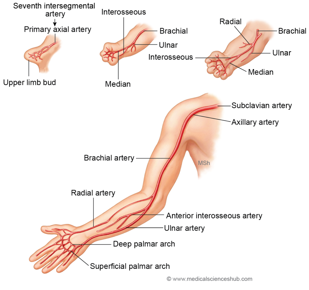• Write a short note on the axis artery of the upper limb and lower limb, including its development and adult derivatives.