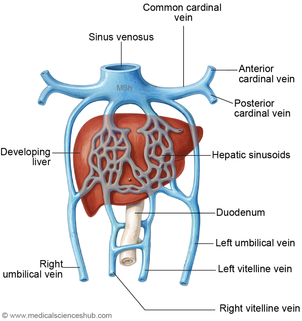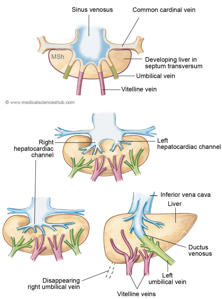 • Suprahepatic segment – originates from the right vitelline vein, also known as the right hepatocardiac channel. The corresponding left hepatocardiac channel normally regresses as the left horn of the sinus venosus diminishes during development.