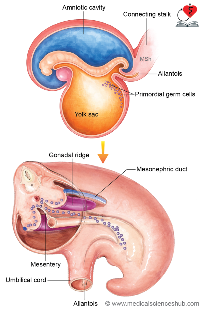 - During the fourth week, primordial germ cells (PGCs) migrate from the yolk sac to the genital ridge via the dorsal mesentery. Their arrival is essential for normal gonadal development.