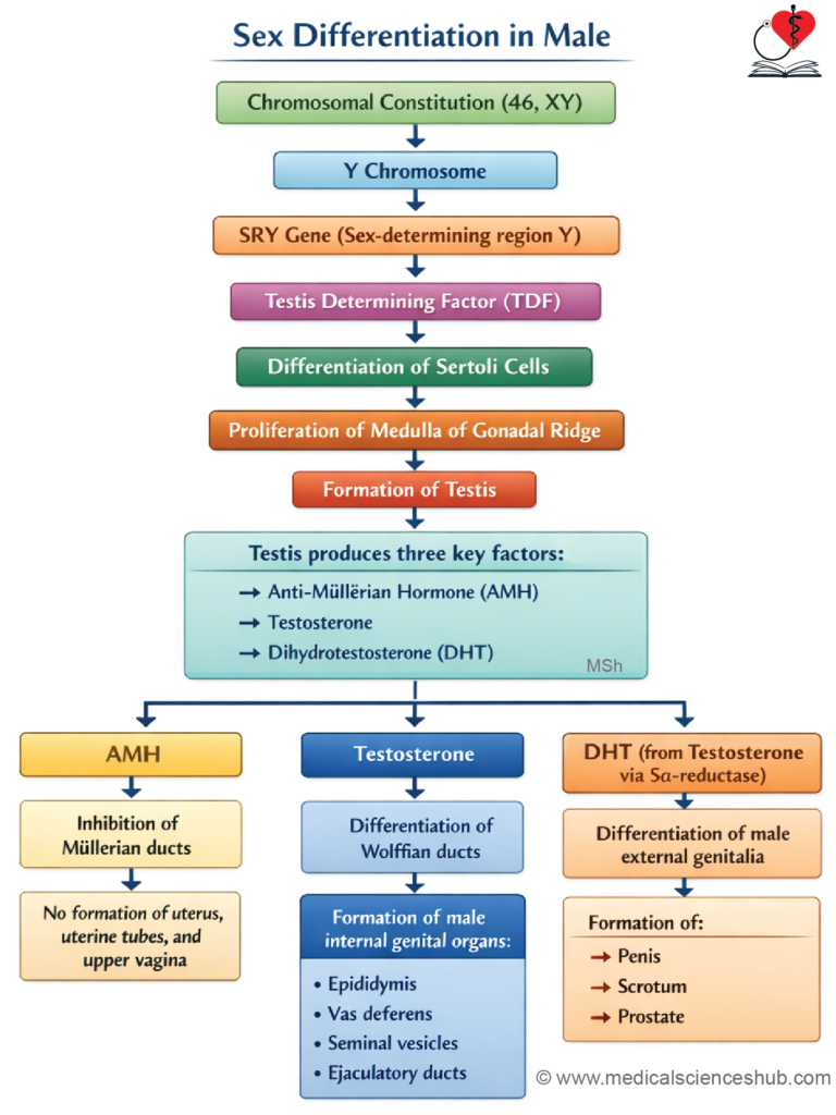 - In individuals with a Y chromosome, the SRY gene (sex-determining region of Y) produces the testis-determining factor (TDF). This factor initiates the differentiation of Sertoli cells, which secrete anti-Müllerian hormone (AMH).