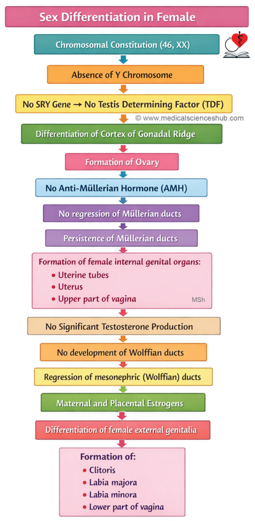 This pattern reflects the absence of fusion of urethral folds and the limited growth of the genital tubercle, which are key features of female differentiation.