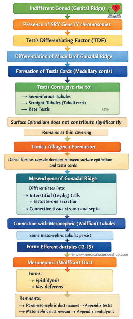 - Mesonephric tubules (approximately 12–15) differentiate into the efferent ductules, which connect the testis to the epididymis.