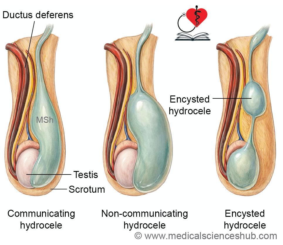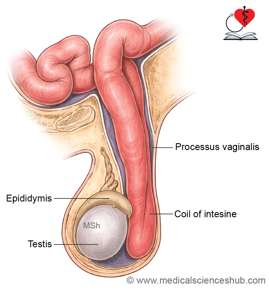 - Congenital hydrocele and inguinal hernia – persistence of the processus vaginalis allows abdominal contents to herniate (inguinal hernia) or fluid to accumulate (hydrocele).