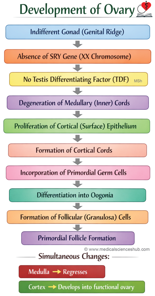 - In the absence of the SRY gene and TDF, the gonad develops into an ovary. The primitive sex cords give rise to follicular cells, and the cortex develops while the medulla regresses. Formation of normal ovarian follicles requires activity of both X chromosomes initially; later, one X chromosome becomes inactivated as a Barr body.