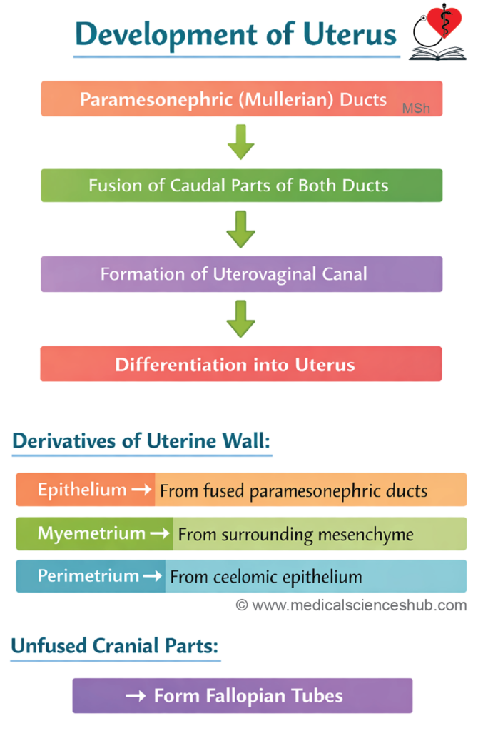 - The uterus develops primarily from the uterovaginal canal, which is formed by fusion of the paramesonephric (Müllerian) ducts.