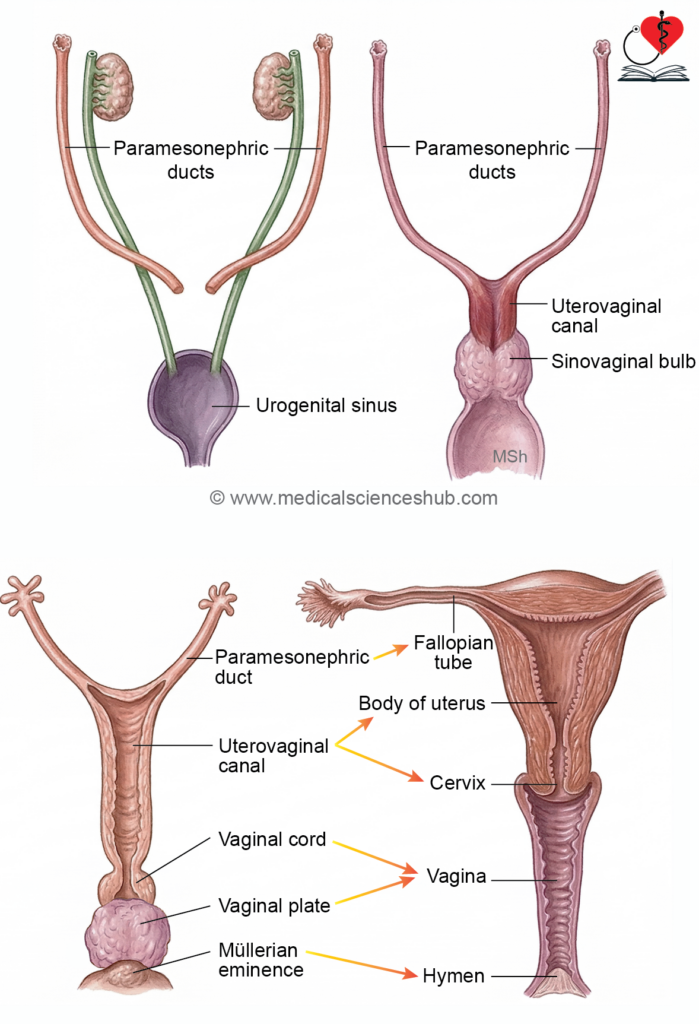 - The paramesonephric ducts give rise to the uterine tubes, uterus, upper part of the vagina, and vaginal fornices.