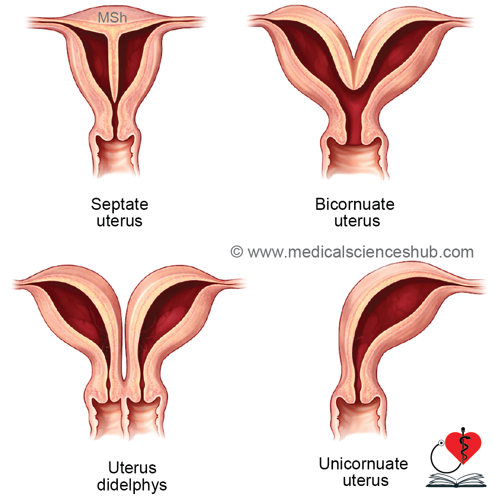 - Unicornuate uterus: Failure of development of one Müllerian duct leads to a single-sided uterus with absence of the opposite uterine horn and tube.