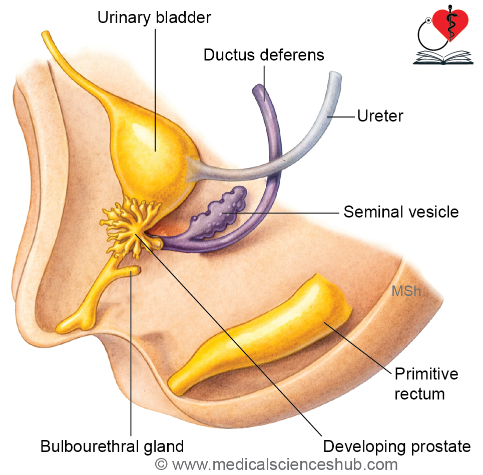 Develops from buds originating in the mesodermal posterior wall of the urethra, located above the openings of the ejaculatory ducts. Typically, five prostatic buds are formed: one anterior, two posterior, and two lateral. - Stroma (muscle, connective tissue, and capsule):