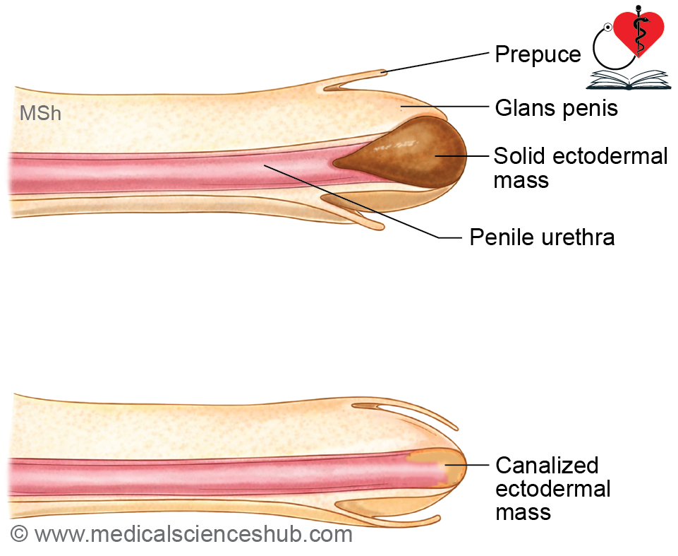 - The endoderm of the phallic part of the urogenital sinus proliferates into the phallus, forming a solid urethral plate, which later canalizes to create the penile urethra.