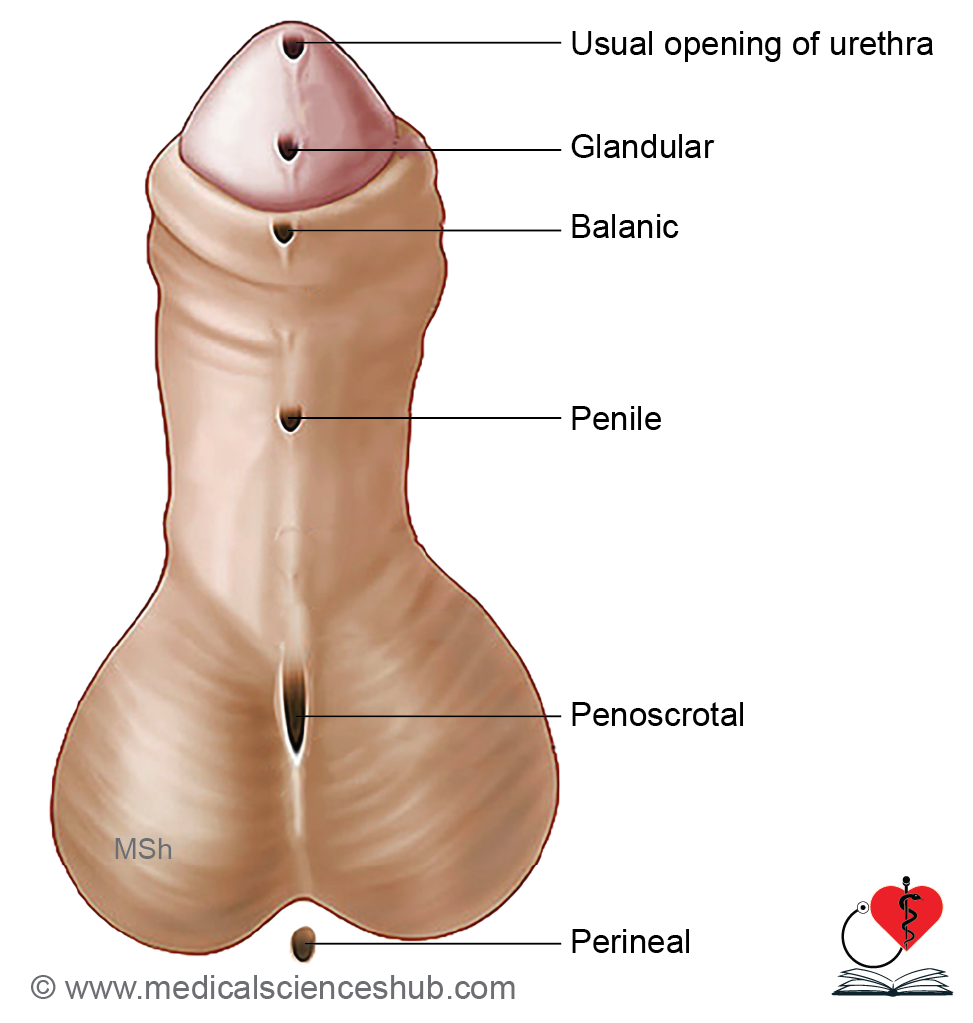 - Glandular: Opening on ventral aspect of the glans.