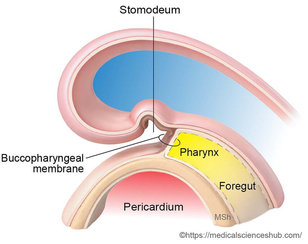 During the fourth week of development, the buccopharyngeal membrane ruptures. This event establishes continuity between the ectoderm of the stomodeum and the endoderm of the foregut, thereby forming a continuous oral passage.