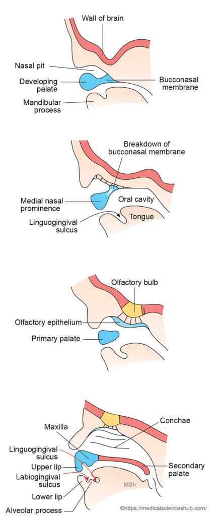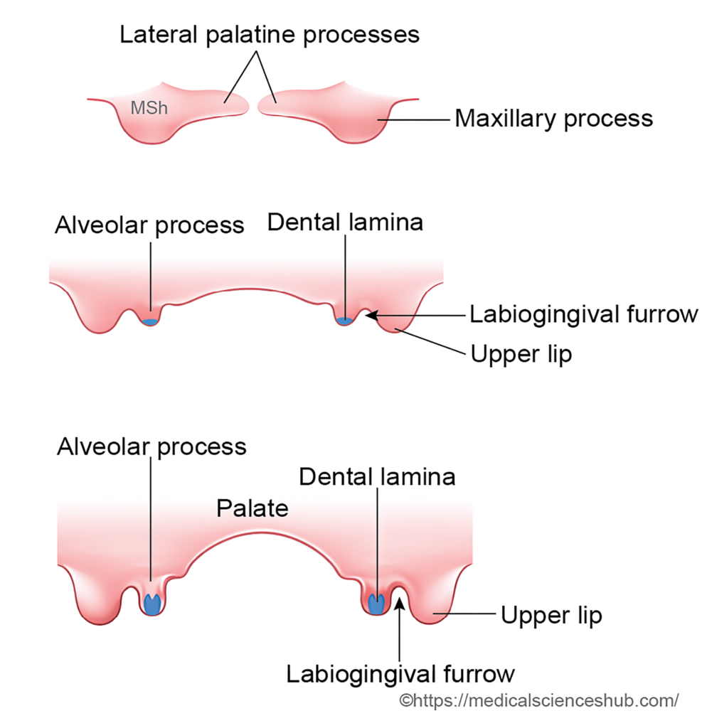 • The tissue located between the linguogingival sulcus and the labiogingival sulcus elevates to form the alveolar process, which later supports the teeth and jaw structures.