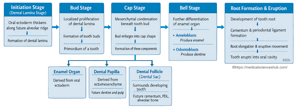 The mouth cavity and its associated structures begin forming very early in embryonic life through a complex but well-organized sequence of developmental events. Small epithelial thickenings, tissue swellings, and migrating cells gradually shape the oral cavity, teeth, tongue, and salivary glands. Understanding these developmental processes explains not only how the normal oral structures are formed but also why certain congenital anomalies of the mouth and teeth occur.