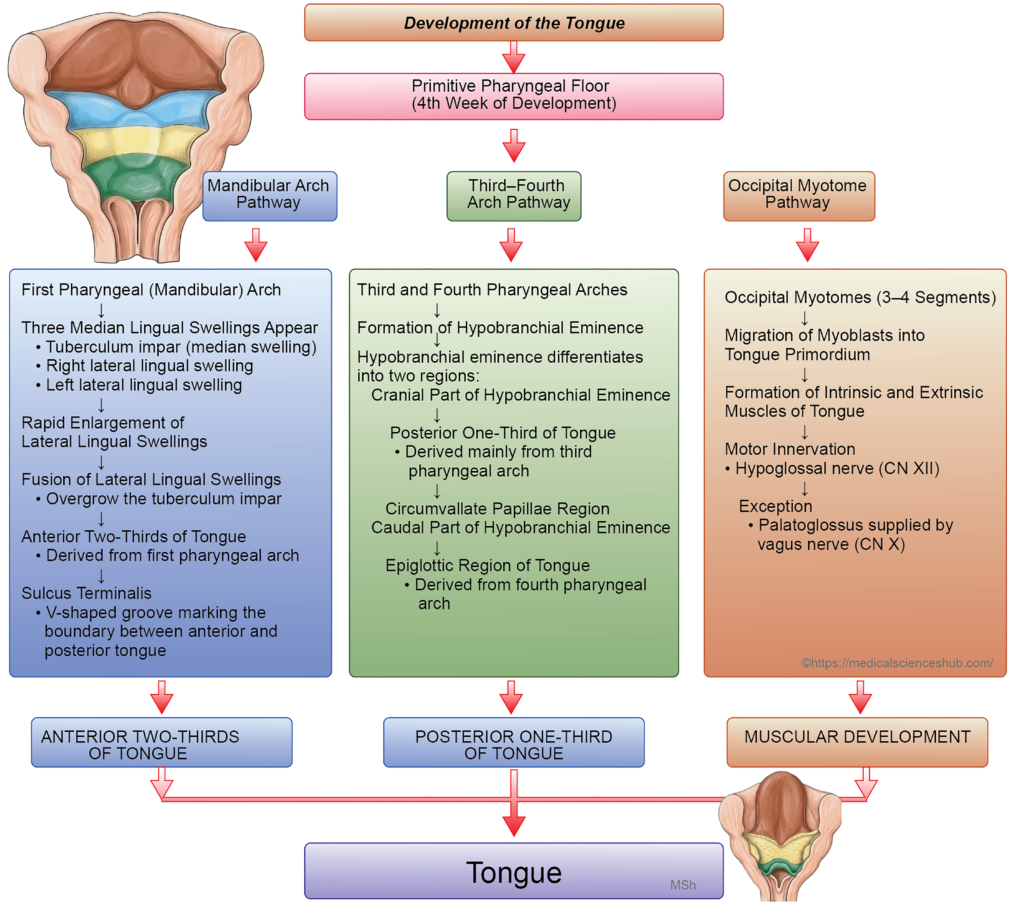 The tongue develops in the floor of the primitive pharynx and the developing oral cavity during early embryonic life. Its formation involves coordinated contributions from several embryonic tissues. The tongue is derived from three principal sources: