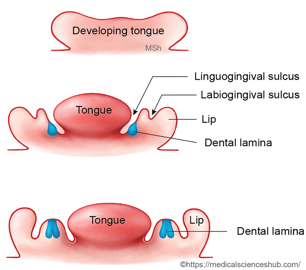 • Lateral to this groove, an ectodermal zone forms the labiogingival sulcus, which gradually deepens during development.