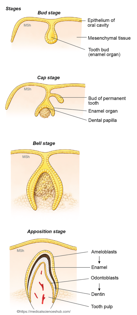 Figure 12.5: Development of tooth: Stages of the dental lamina, bud stage, cap stage, bell stage and apposition stage