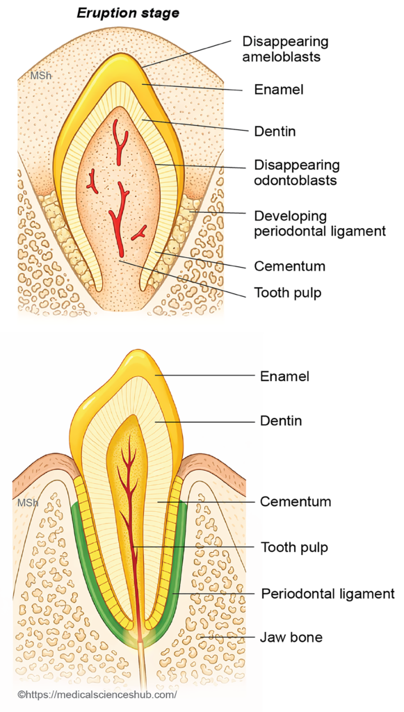 Elongation of the tooth root and remodeling of surrounding tissues gradually move the tooth toward the oral cavity, resulting in tooth eruption. The timing of eruption varies among different teeth.