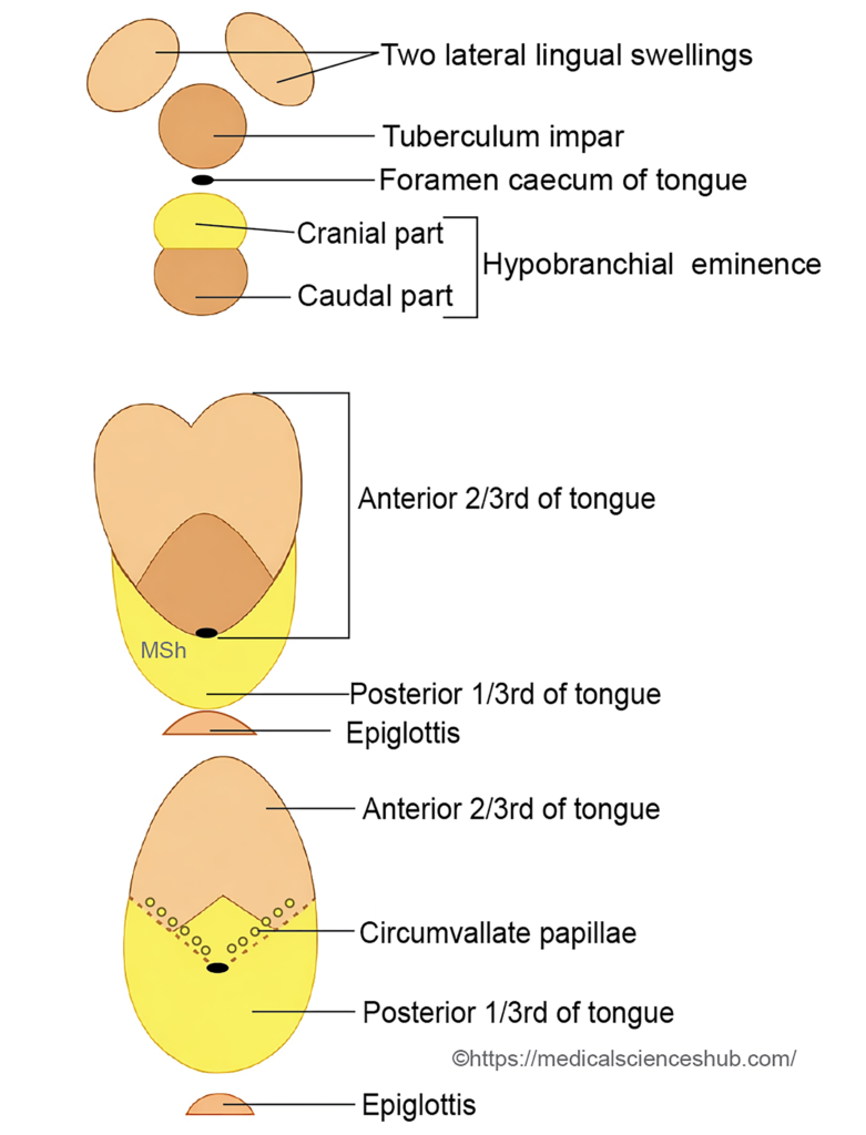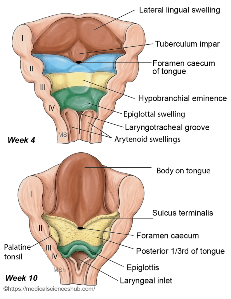 • The ventral part of this structure enlarges to form the posterior one-third of the tongue, while the caudal part contributes to the epiglottis.