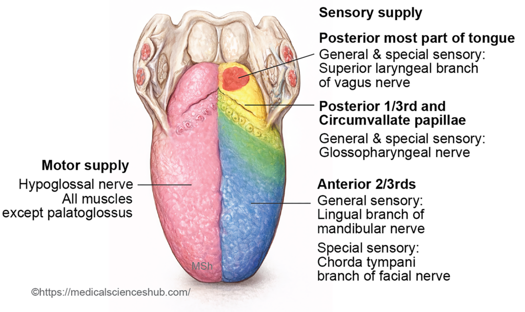 • The anterior two-thirds of the tongue develops from the first pharyngeal (mandibular) arch. Therefore, its general sensory innervation is provided by the lingual nerve, a branch of the mandibular division of the trigeminal nerve (CN V3). Taste sensation from this region is transmitted through the chorda tympani, a branch of the facial nerve (CN VII) that joins the lingual nerve.