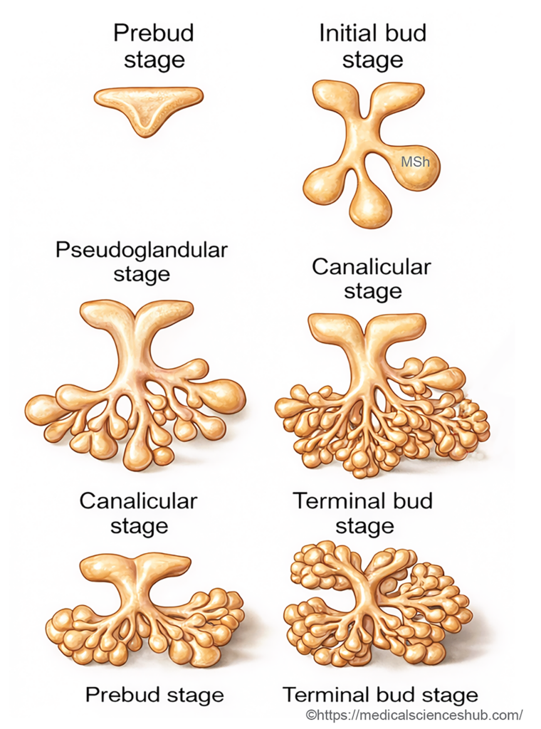 • Developmental Stages: The formation of salivary glands proceeds through several recognizable stages: prebud stage, initial bud stage, pseudoglandular stage, canalicular stage, and finally the terminal bud stage, during which functional secretory units are established.