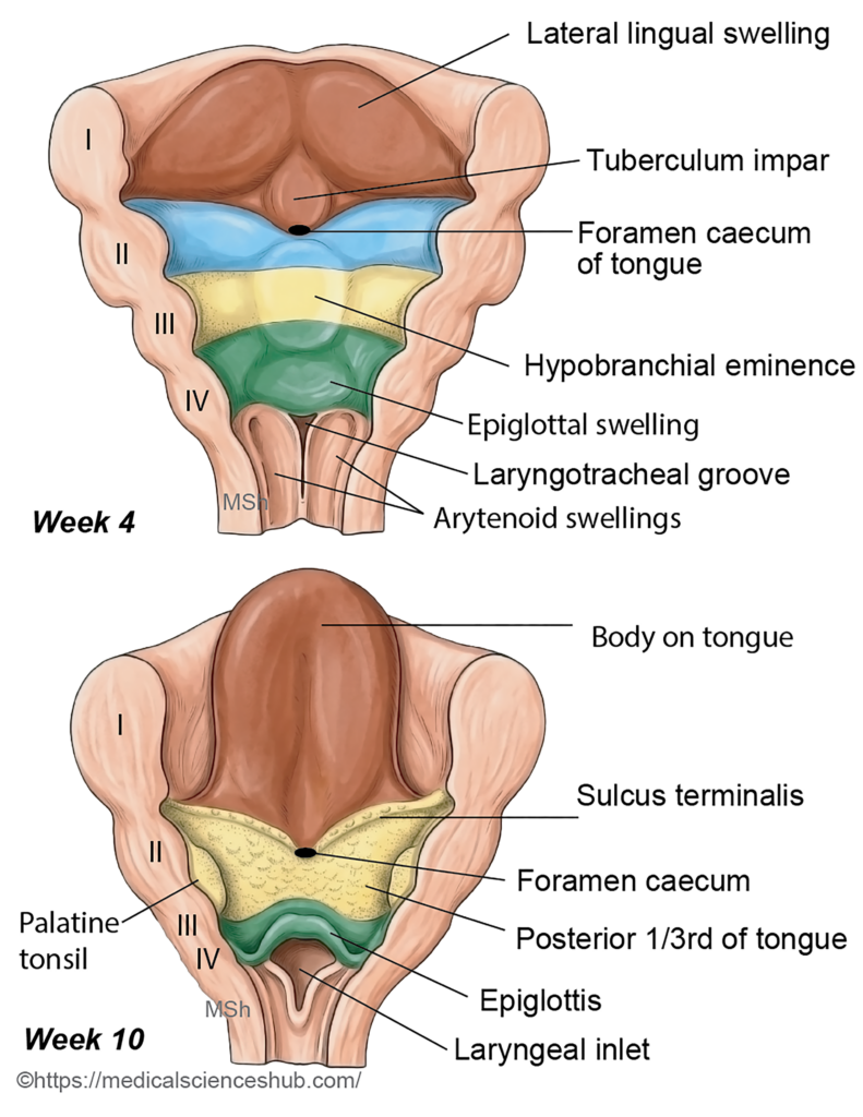 • As development progresses, differential growth of the fourth and sixth pharyngeal arches modifies the surrounding mesenchyme. This process transforms the initial opening of the larynx into a characteristic T-shaped laryngeal orifice.