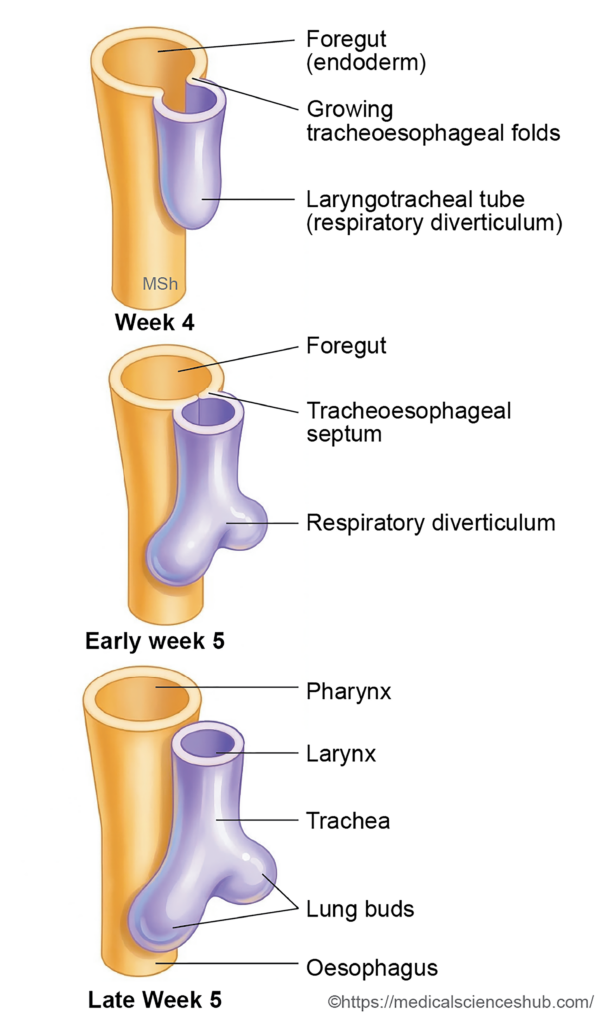 • On each side of the laryngotracheal tube, two longitudinal ridges called the tracheoesophageal folds develop. These folds grow toward each other and fuse in the midline to form the tracheoesophageal septum, which separates the laryngotracheal tube anteriorly from the oesophagus posteriorly.