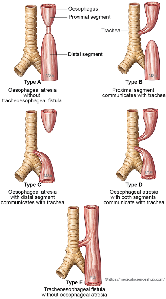 Figure 15.4: Types of tracheoesophageal fistula (Types A to E according to Gross classification)