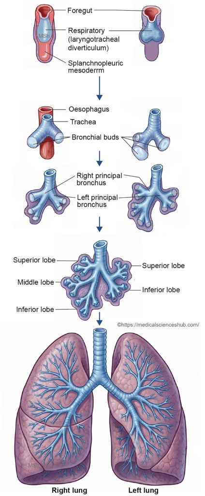 • At its distal end, the laryngotracheal tube divides into two outgrowths, forming the right and left lung buds. These buds represent the early primordia of the future lungs.