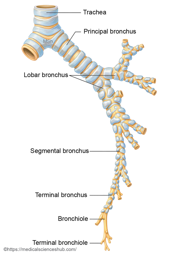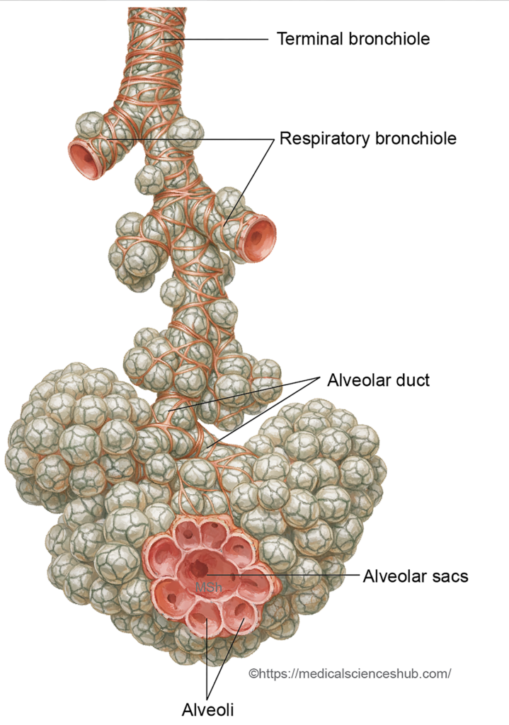 • The distal branches differentiate into bronchioles, respiratory bronchioles, alveolar ducts, and eventually alveoli.