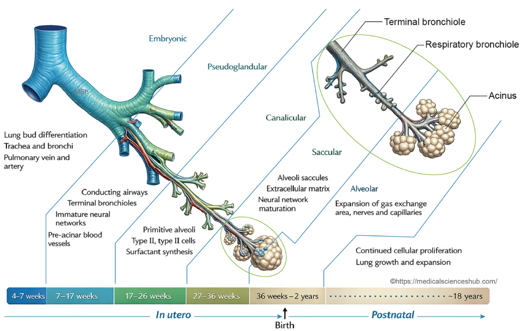 The development and functional maturation of the lungs occur through a sequence of well-defined stages during fetal and early postnatal life. These stages reflect progressive differentiation of the bronchial tree, terminal air spaces, and structures required for gas exchange.