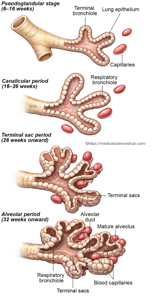 3. Terminal saccular period (26 weeks to birth): Numerous terminal sacs (primitive alveoli) form, and the epithelial lining becomes thinner. Type I and Type II pneumocytes differentiate, and surfactant production begins, improving the lung’s ability to function after birth.