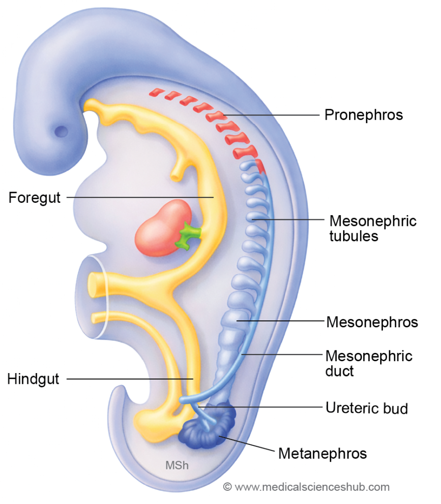 - Pronephros – This rudimentary kidney appears in the cervical region at the beginning of the 4th week. It is nonfunctional in humans and rapidly regresses. Its duct persists and becomes the mesonephric duct.