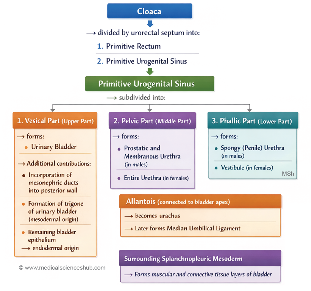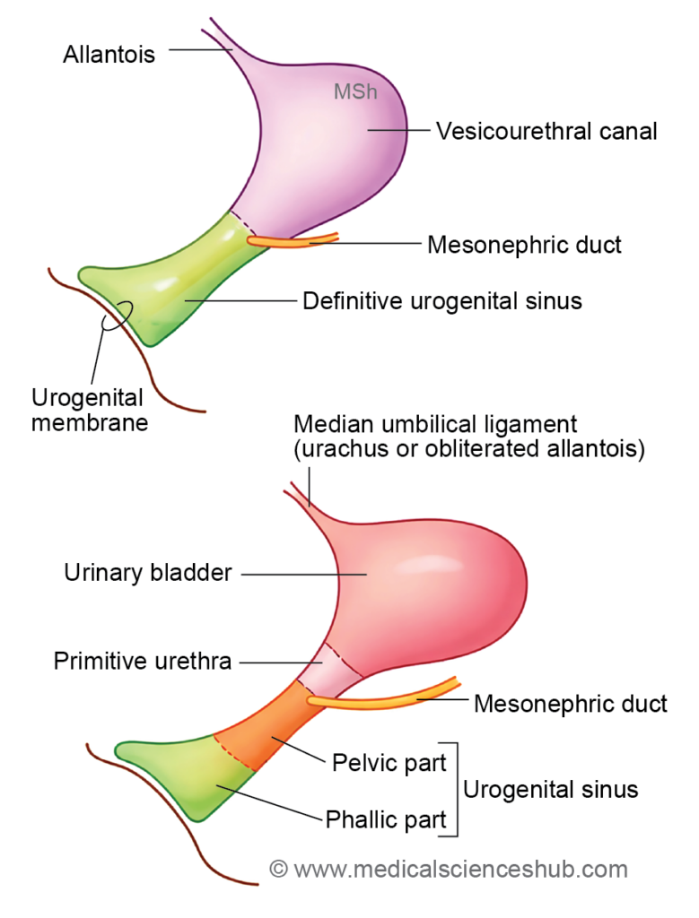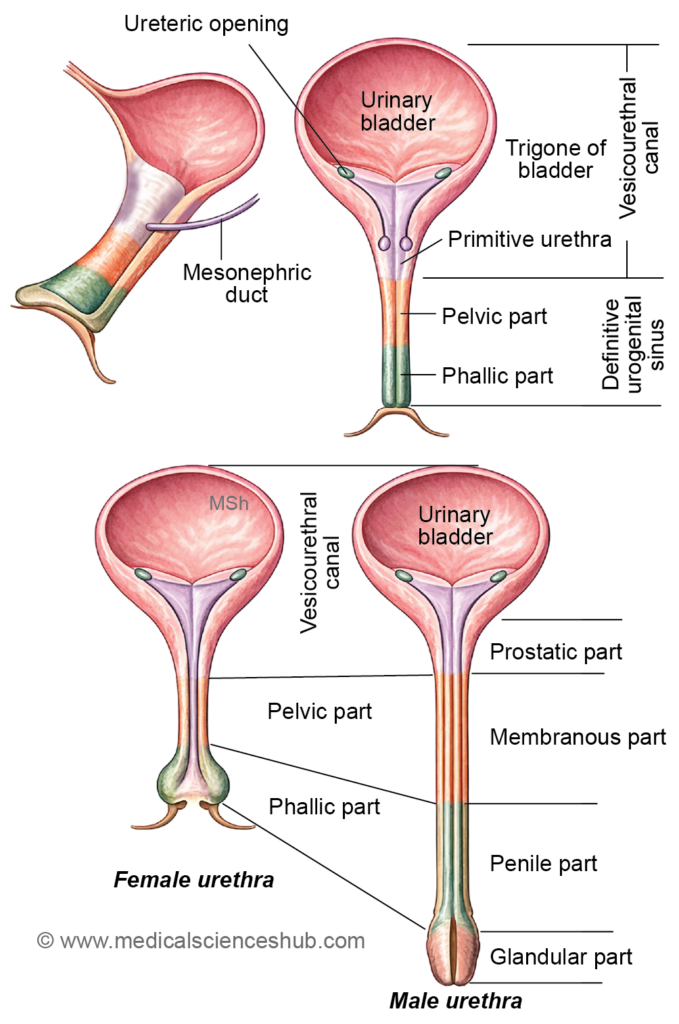 - Later, the entry of the mesonephric ducts further subdivides the primitive urogenital sinus into a cranial vesicourethral canal and a caudal definitive urogenital sinus, which contribute to the formation of parts of the urinary bladder and urethra.