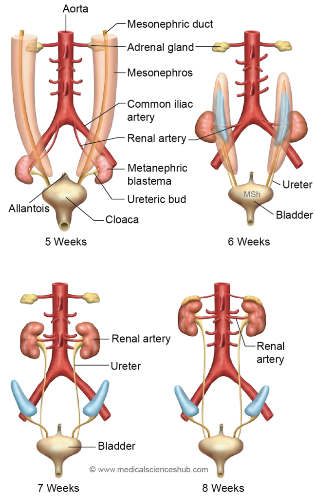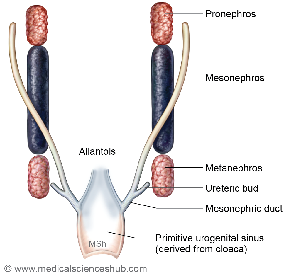 - With progressive incorporation of the mesonephric ducts into its posterior wall, their openings become separated from those of the ureteric buds.