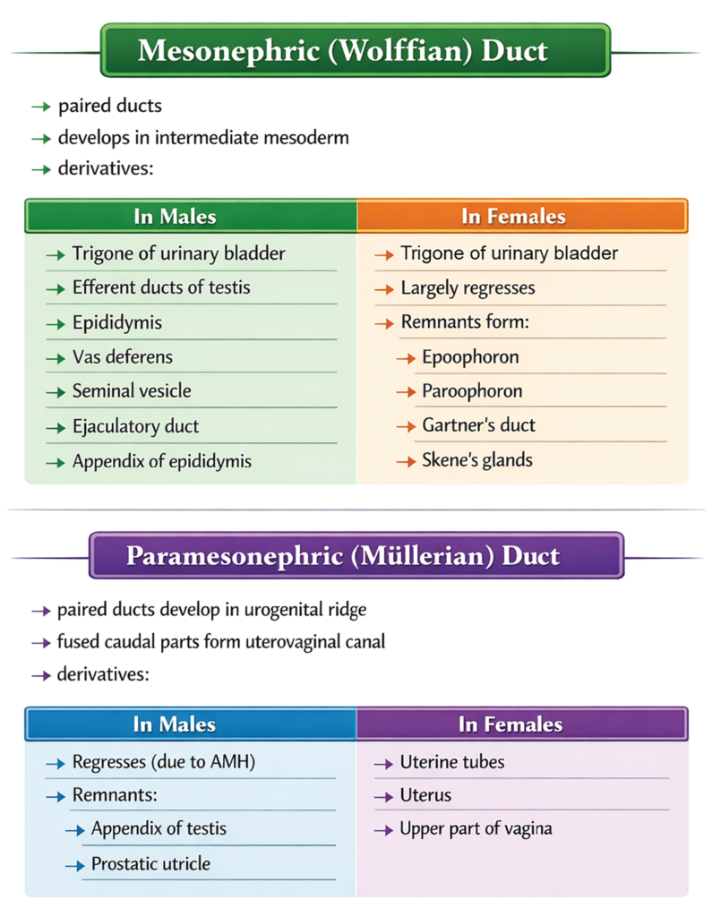 - During early embryonic development, two pairs of primitive ducts contribute to the formation of the reproductive tract: the mesonephric (Wolffian) ducts and the paramesonephric (Müllerian) ducts. These ducts initially coexist in both sexes but later differentiate in a sex-specific manner. The mesonephric ducts predominantly develop into components of the male genital duct system, whereas the paramesonephric ducts give rise to the female reproductive ducts.