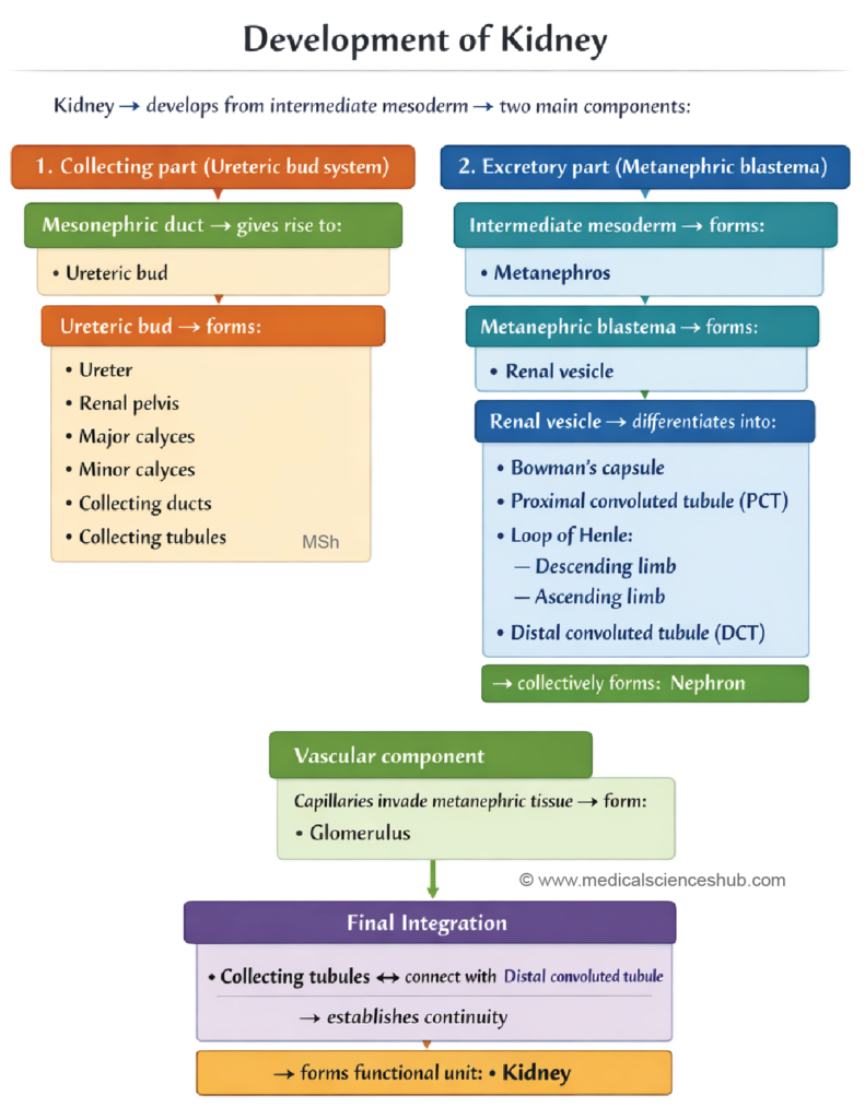 - Kidney development occurs through coordinated interactions between the ureteric bud and the metanephric blastema, which together form the collecting and secretory components of the definitive kidney.