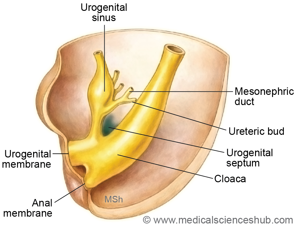 - The cloaca is partitioned by the urorectal septum into a ventral urogenital sinus and a dorsal primitive rectum.