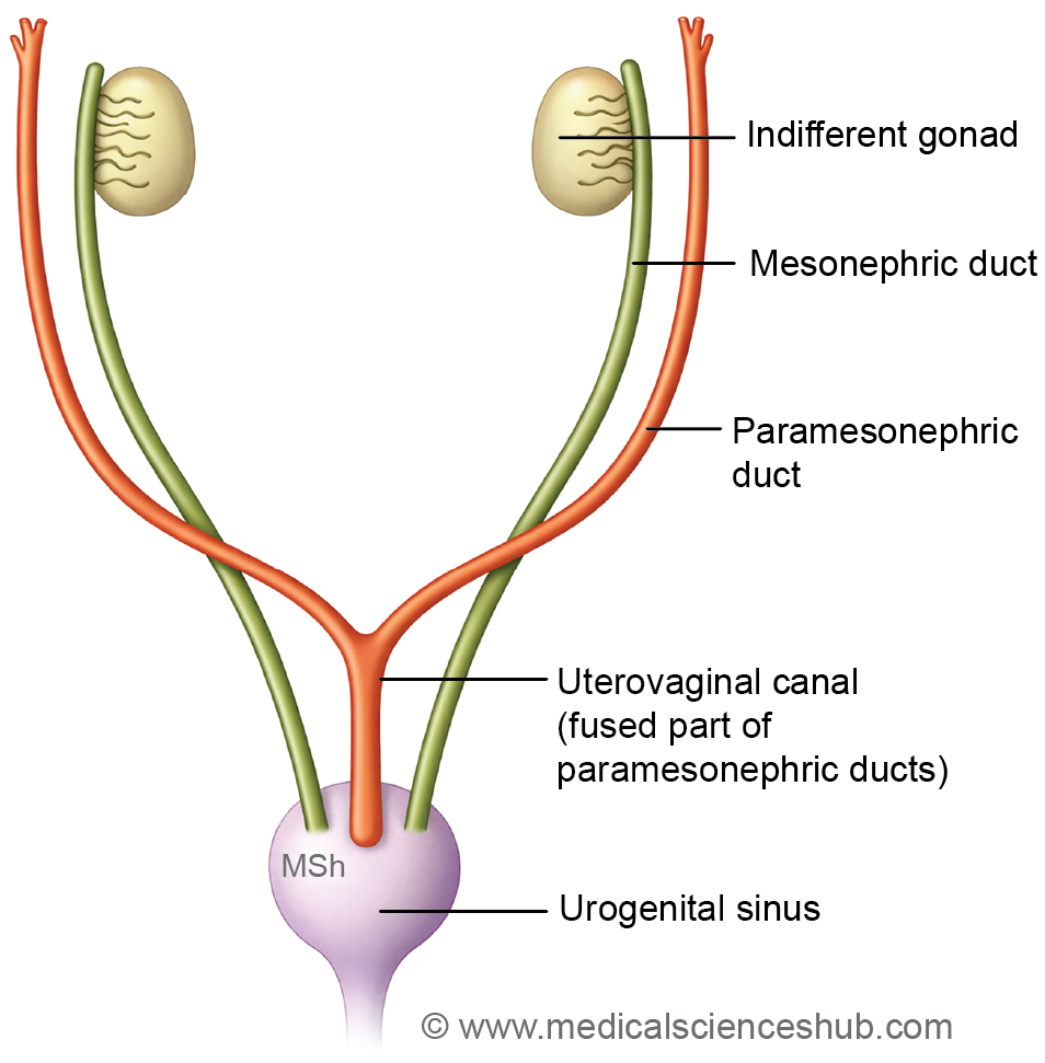 - Around the 6th week of intrauterine life, the coelomic epithelium lining the peritoneal cavity invaginates into the intermediate mesoderm to form these ducts. As development proceeds, the ducts grow caudally and gradually shift medially. By approximately the third month, they cross ventral to the mesonephric ducts and fuse with each other in the midline, forming the uterovaginal canal. This fused canal later establishes communication with the definitive urogenital sinus.
