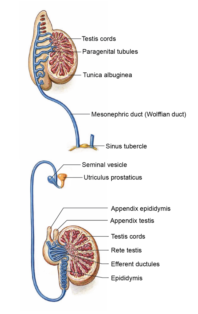 - In males, several mesonephric tubules persist and differentiate into components of the male reproductive tract. A group of these tubules establishes connections with the developing testis and forms the efferent ductules, which transport sperm from the rete testis to the epididymis.