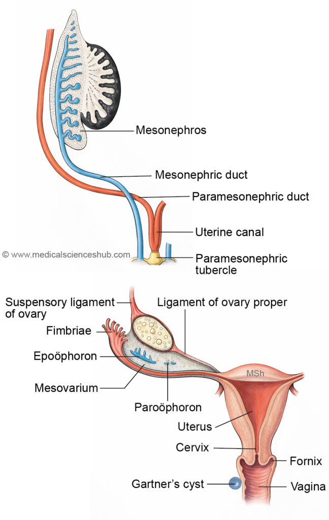- The mesonephric duct may persist as Gartner’s duct, which sometimes connects with the tubules of the epoöphoron. Together, these structures form the organ of Rosenmüller (epoöphoron), derived from both the mesonephric duct and mesonephric tubules.