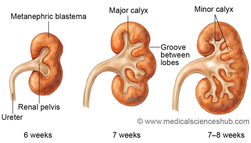 - Metanephros – The permanent kidney begins to develop in the lumbosacral region at the start of the 5th week. It forms the definitive secretory units (nephrons) of the human kidney.