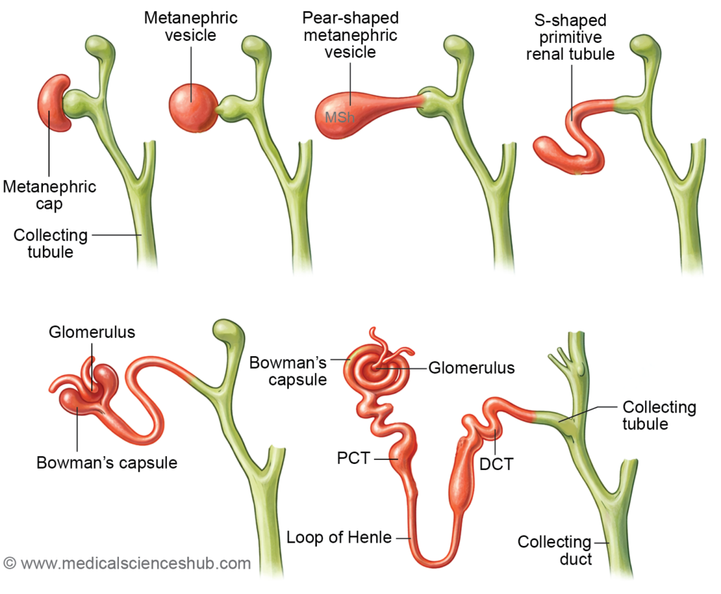 - Cells of the metanephric blastema surrounding the branching ureteric bud differentiate to form the metanephric cap. This tissue condenses and transforms into a metanephric vesicle, which later elongates into an S-shaped primitive renal tubule.