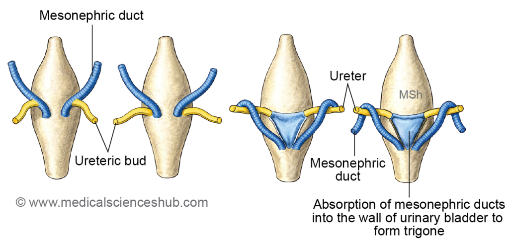- The incorporated segments of the mesonephric ducts form a triangular area on the posterior wall, known as the trigone of the urinary bladder, located between the openings of the ureters and mesonephric ducts.