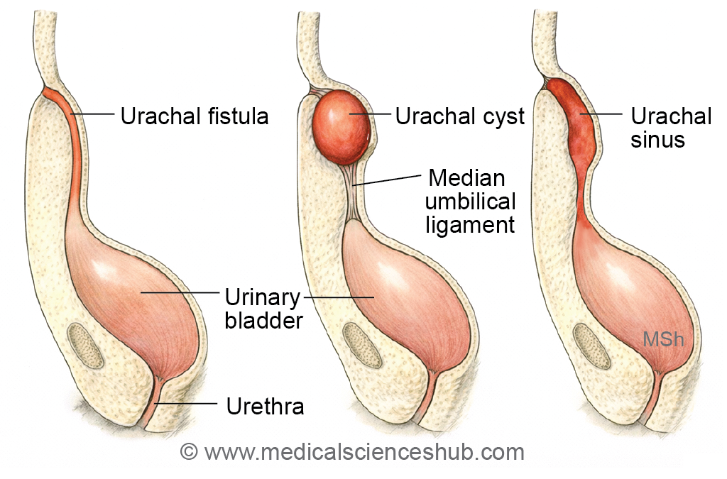 - Urachal fistula: Caused by persistence of the allantois, resulting in a patent tract between the urinary bladder and the umbilicus.