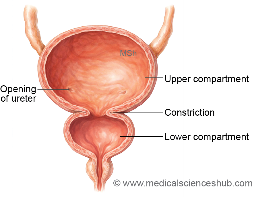 - The urinary bladder consists of an inner transitional epithelium, a middle connective tissue and smooth muscle layer, and an outer serous (connective tissue) layer. Its interior contains a smooth triangular area called the trigone, where the ureters open at the superolateral angles and the internal urethral orifice lies at the apex.