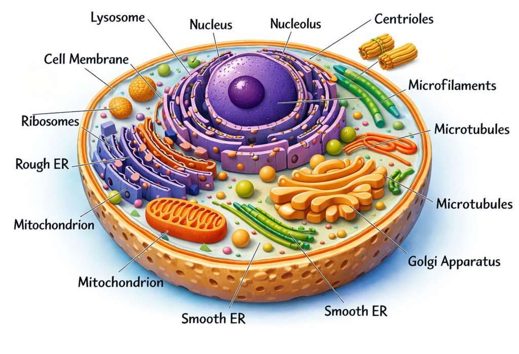 - The cytoplasm is the internal fluid matrix that contains numerous membrane-bound organelles. Common organelles include mitochondria, ribosomes, lysosomes, peroxisomes, centrioles, endoplasmic reticulum, and the Golgi apparatus, each performing specialized metabolic or synthetic functions.